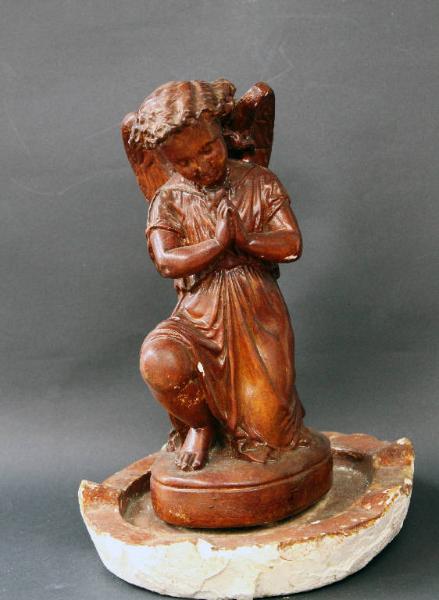 Prototipo in legno rappresentante un angelo inginocchiato con le mani giunte.