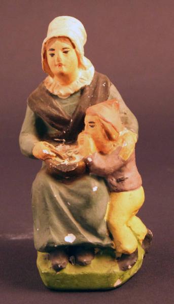 Statuetta rappresentante una donna seduta con un cesto sulle ginocchia. Accanto a lei un bambino è intento a mangiare il contenuto della cesta.