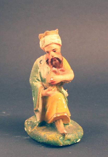 Statuetta rappresentante un Re Magio inginocchiato che tiene tra le mani un dono per Gesù Bambino.