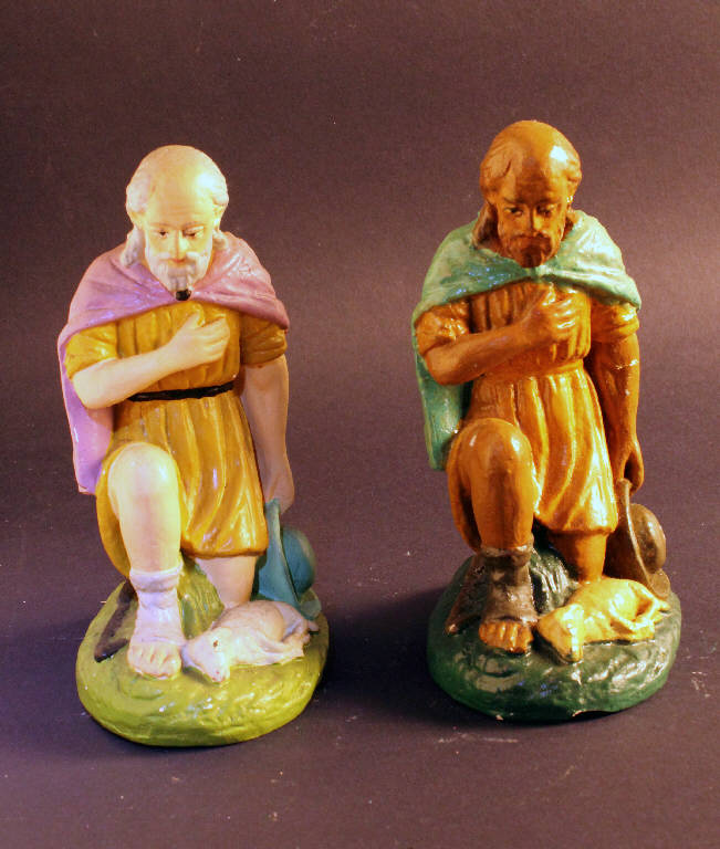Statuetta rappresentante un pastore inginocchiato con il cappello tra le mani. Accanto all'uomo vi è una pecora ed un bastone.