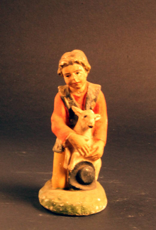 Statuetta rappresentante un giovanissimo pastore inginocchiato che tiene tra le braccia un agnello ed un cappello.