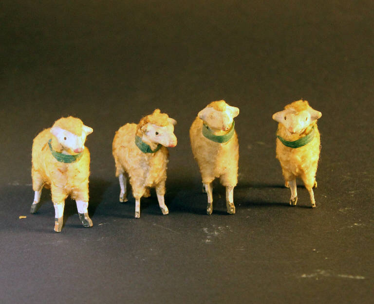 Serie di quattro pecore realizzate in gesso e legno ricoperte con stoffa per quanto riguarda la resa del pelo.
