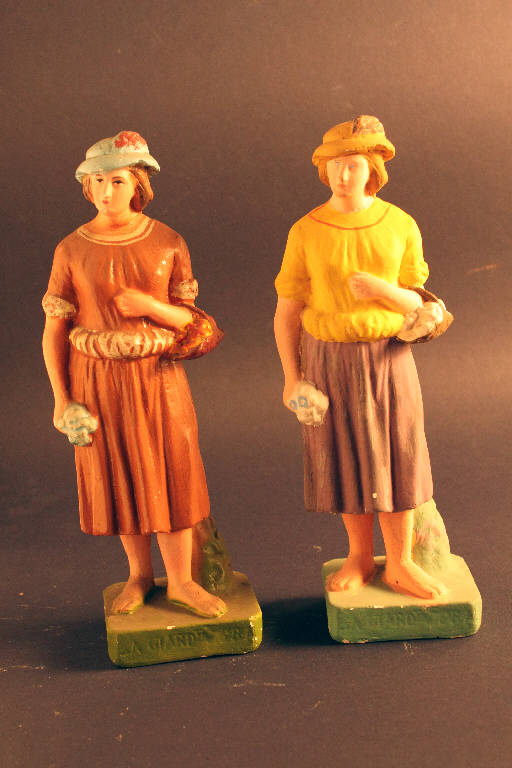 Statua da presepio rappresentante una donna con indosso un grazioso cappello e nella mano destra un mazzo di fiori. Sul braccio sinistro porta un cesto con dei fiori.
