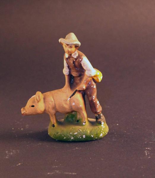 Statua da presepio rappresentante un giovane uomo con un maiale.