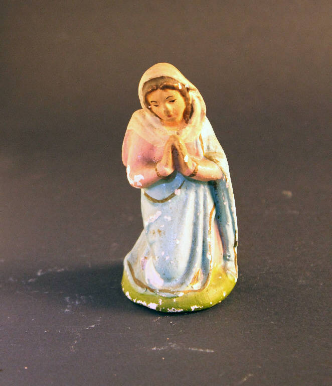 Statuetta da presepio rappresentante la Madonna inginocchiata con le mani giunte in preghiera.