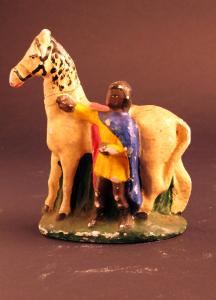 Uomo con ampio mantello iintento a tenere per le briglie un cavallo.
