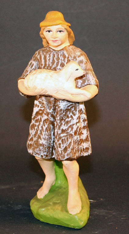 Pastore con agnello tra le mani. La figura indossa un copricapo ocra.