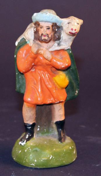 Pastore con agnello sulle spalle. La figura indossa un copricapo, un abito arancione ed un mantello verde.