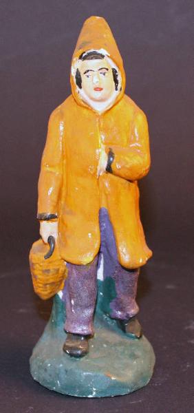Uomo caratterizzato da una giacca con cappuccio arancio reca nella mano destra una cesta. La mano sinistra è infilata nella giacca come per proteggersi dal freddo.