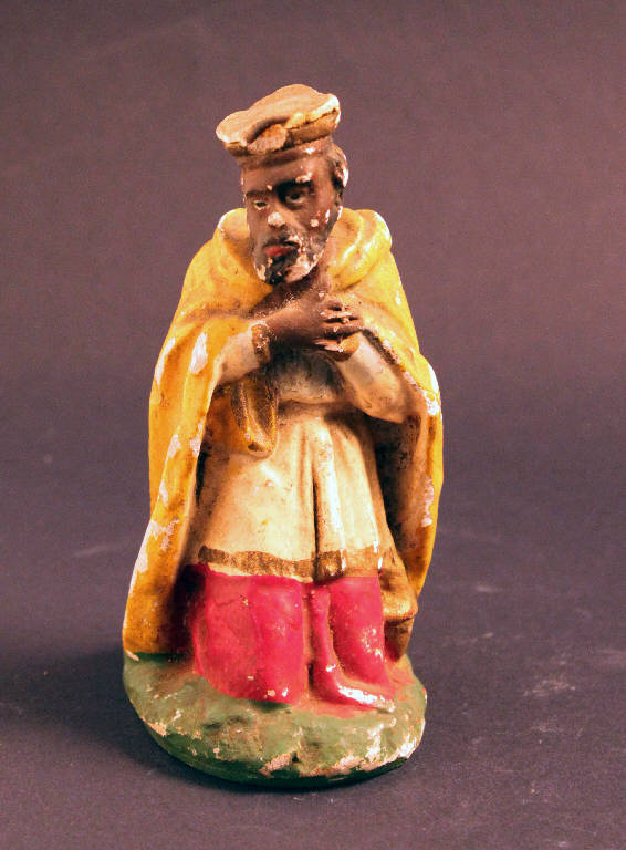 Re Magio moro inginocchiato in atto di adorazione. La figura indossa una preziosa veste rosso, bianca ed oro ed un mantello giallo.