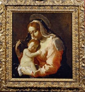 - NOTIZIE STORICO CRITICHE Il dipinto si inserisce tra le prove più private del pittore come il "Tobia guarisce il padre" di Huston, la "Madonna con San Luca" della Valletta, la "Madonna e santi" di Malta (Rabat) e l' "Agar e Ismaele" di Monaco. L'opera riprende un'invenzione arcaica, uno schema quasi quattrocentesco, nel gesto affettuso della Madonna e del Bambino, reinterpretata con il gusto della pittura napoletana del Seicento. Lo stesso gesto affettuoso si ritrova nella "Madonna con Bambino, San Giovanni Battista e Sant'Antonio Abate" del Verdala Palace di Boschetto a Rabat, assimilabile anche per la fattura particolare del velo di Maria, ampio e ricadente in pieghe molli e umide (cfr. J.T. Spike, 1999, pp. 24, 68). Nel percorso artistico del pittore l'opea si colloca nel fecondo periodo napoletano (1653-1660), quando il pittore raggiunse la sintesi definitiva e personale delle numerose precedenti influenze ricevute a Roma durante il suo primo periodo formativo. (Notizie storico-critiche relative al progetto di catalogazione dell'anno 2005).\n\nIl dipinto raffigura la Vergine che con gesto protettivo allarga il velo trapunto di stelle per avvolgere il Bambino, richiamo iconografico al tradizionale appellativo mariano di stella maris. Questo dipinto va inserito tra le opere realizzate dal calabrese Mattia Preti durante il suo lungo soggiorno nell¿isola di Malta, dove si stabilisce\ndefinitivamente intorno al 1660, realizzando una fitta serie di commissioni per numerosi edifici di culto. La peculiarità di quest¿opera risiede nella vena espressiva e\nintimistica, lontana dalla teatralità e dall¿enfasi narrativa tipica delle invenzioni spettacolari del Preti più ufficiale.\nIl dipinto è stato acquistato da Luigi Lechi nel 1993. (Notizie storico-critiche relative al progetto di aggiornamento di catalogazione del 2013-2014).