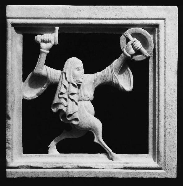Lastra quadrangolare lavorata a traforo, con decoro figurativo rappresentante un fauno con camicione a maniche larghe e velo panneggiato, armato di spada (tronca) e scudo.