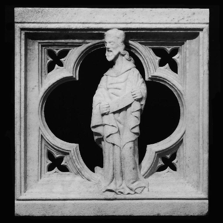Lastra quadrangolare lavorata a traforo, con decoro geometrico quadrilobato e fogliette a cui è sovrapposta una figura di profeta che regge in mano un cartiglio.
