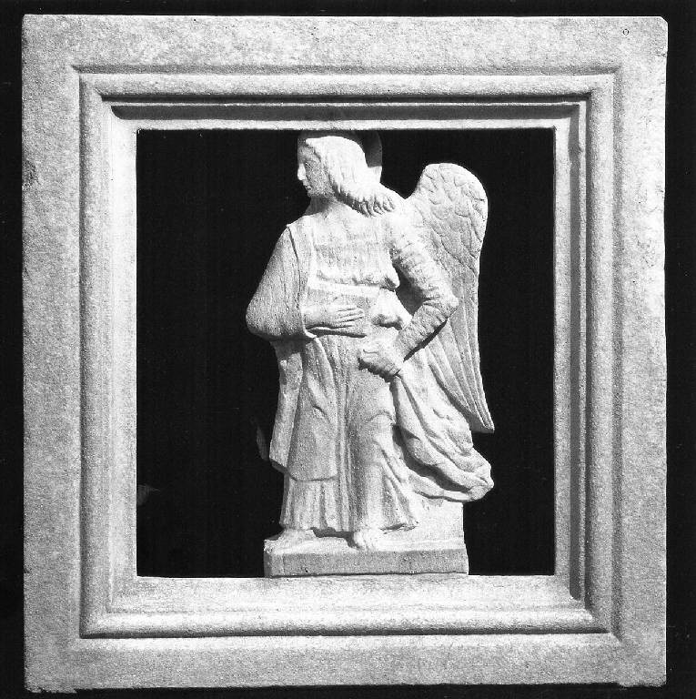 Lastra quadrangolare lavorata a traforo, con al centro figura di angelo raffigurato di profilo, mentre regge un libro nella mano sinistra.