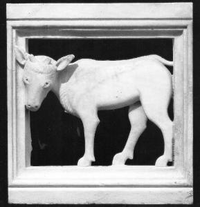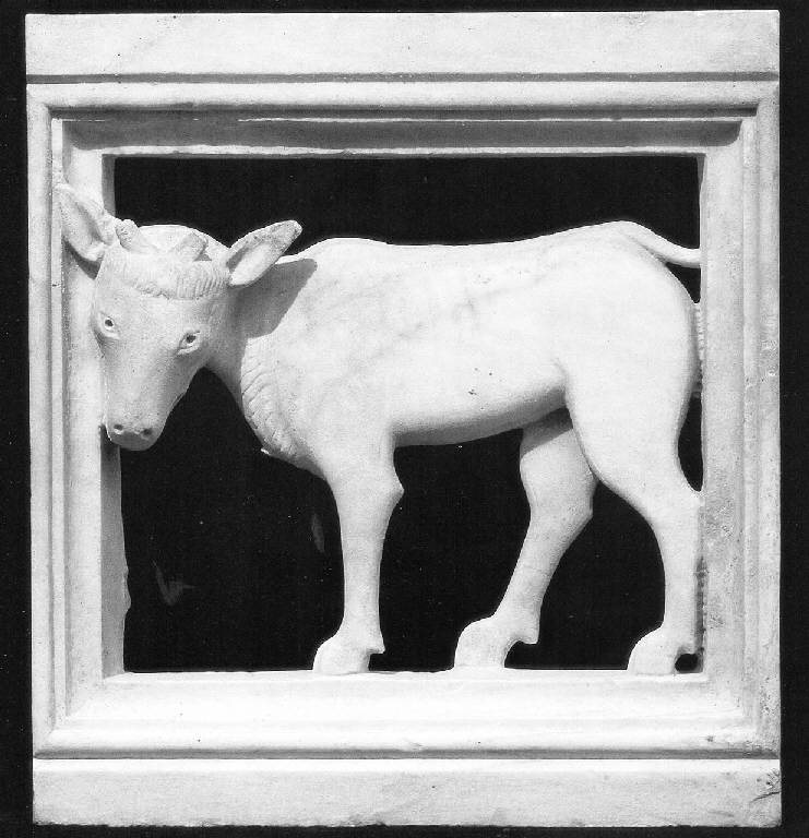 Lastra quadrangolare lavorata a traforo, occupata dalla figura di bue rappresentato con corpo di profilo e muso frontale.