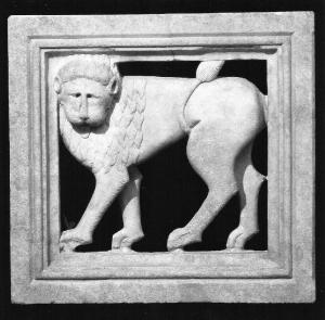 Lastra quadrangolare lavorata a traforo, con figura di leone che la occupa quasi per intero, rappresentato con corpo di profilo e muso frontale.