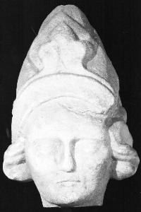 Testa a tutto tondo, bifronte, priva del volto nella parte posteriore, con copricapo a punta stondato, con motivo decorativo trilobato nella parte frontale, da cui fuoriescono due ciocche di capelli simmetriche.