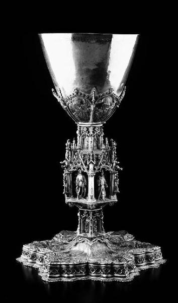 Piede polilobato con pianale decorato da sei figure di apostoli e sei stemmi a smalto champlevés con le insegne di Gian Galeazzo Visconti. Il gradino è decorato con cerchietti e croci traforate. Stelo composto da ricca architettura gotica con tre ordini di edicole ad archi trilobi. Sul dado inferiore e su quello superiore, due serie di sei edicole ciascuna con smalti traslucidi raffiguranti santi. Serie centrale costituita da sei edicole aggettanti, sostenute da gattoni dorati e culminanti in timpani traforati, sostenuti da archi trilobi; al centro, sei figure sacre (Madonna con Bambino, san Filippo, san Pietro martire, san Bonifacio, sant'Antonio abate e san Giovanni Battista) ad alto rilievo che emergono da fondale smaltato. Reggicoppa con sei figure di apostoli racchiusi in altrettante edicole ad arco trilobo. Tazza della coppa ad imbutitura regolare, con sviluppo ellittico in altezza.