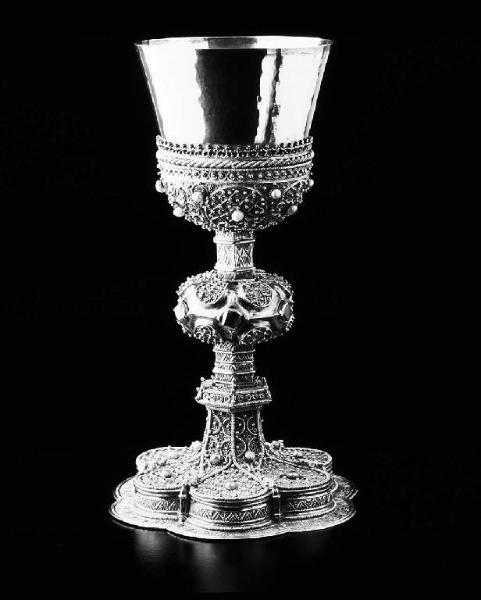 Piede polilobato con gradino a decorazioni geometriche; il piano è decorato a filigrana e arricchito con perle. Al centro dello stelo è presente un nodo riccamente decorato con gemme verdi e inserti in filigrana. Anche il reggicoppa , che sostiene una coppa dorata senza ornamenti, è decorato a filigrana e impreziosito di perle.