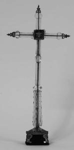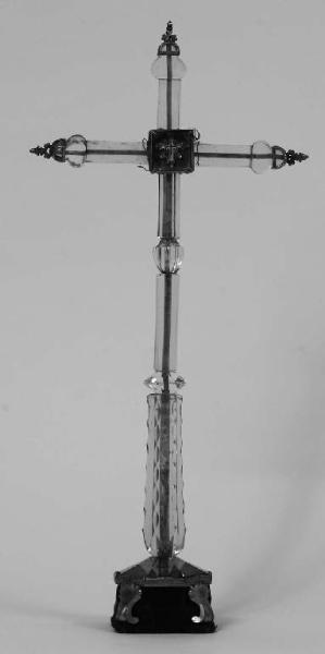 Croce in cristallo di rocca con anima in metallo che sporge dalle estremità superiori. La croce poggia su base in legno e velluto rosso con volute dorate agli angoli; è composta da più segmenti di cristallo lavorati conmotivi decorativi. All'incrocio dei bracci è presente un piccolo reliquiario rettangolare con una croce e decorazioni a filigrana dorata su fondo rosso; sul retro del reliquiario è presente un sigillo in ceralacca rossa.