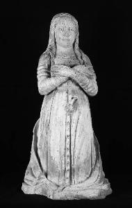 Statua a tutto tondo raffigurante Maria Vergine inginocchiata, le braccia incrociate sul petto; è abbigliata con una veste a maniche lunghe, decorata lungo i polsi, lo scollo e la fascia centrale del corpetto; la parte inferiore dell'abito presenta una cintura che scende dalla vita fino a terra, a rilievo. Tutto attorno al corpo, nella parte bassa, è disposto un manto drappeggiato e lavorato lungo i bordi, che nella parte posteriore, e in parte anche nella zona anteriore, si presenta mutilo.