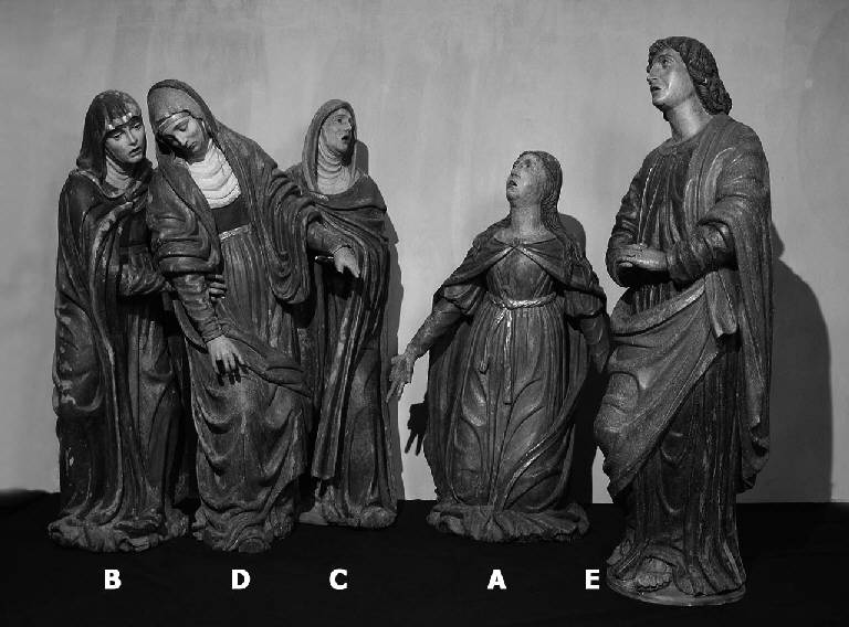 Figura femminile stante ma non eretta, con il busto e la testa lievemente reclinati verso destra; il braccio sinistro è steso lungo il corpo mentre il destro è lievemente piegato e lontano dal corpo. E' abbigliata con una lunga veste rossa legata in vita, il capo è velato e coperto con un manto azzurro bordato d'oro che avvolge il corpo anche nella parte bassa anteriore, fino ai piedi. Mani mutile di alcune dita.