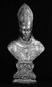 Basamento a volute, decorato dal basso con una conchiglia, racemi a fogliame e festoni che racchiudono lo scudetto centrale, e una testa di cherubino. Il santo è rappresentato con il volto severo e sbarbato. La mitra sul capo è decorata negli spicchi con due ovali lisci in rilievo, circondati da motivi ornamentali simili a quelli riproposti nelle fasce. La veste si presenta riccamente decorata con motivi a racemi.