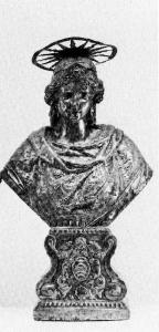 Basamento a volute, decorato dal basso con una conchiglia, racemi a fogliame e festoni che racchiudono lo scudetto centrale, e una testa di cherubino. La figura di giovane donna è rappresentata con un'aureola a raggiera dietro al capo, sopra i capelli lunghi è appoggiato un diadema che si allarga al centro creando due punte opposte in senso verticale; la veste è riccamente decorata con un motivo a fogliami.