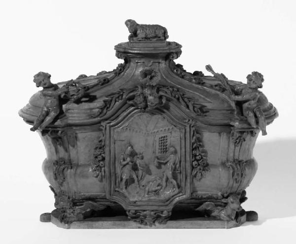 Il modellino presenta un cofanetto a base quadrangolare, con i quattro lati bombati e decorati. Poggia sui quattro simboli degli evangelisti e, nella parte centrale del lato lungo, sopra un decoro floreale che fa anche da sostegno alla lastra con la rappresentazione a rilievo della Decollazione del Battista. Altri decori floreali corrono lungo i bordi della lastra e sopra l'ansa centrale del coperchio, accompagnati a teste di cherubini. Sul coperchio sono rappresentati due putti, seduti sul bordo della cornice. Al centro, sul rialzo, è posta la figura di un agnello sopra ad un basso zoccolo. Anche il coperchio è decorato con altri fiori e fogliami.