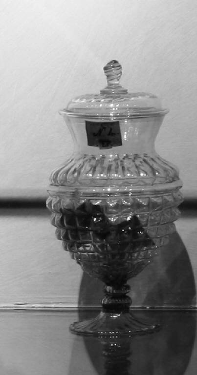Il piede svasato a base circolare è decorato da un motivo ondulato. La coppa è sorretta da due nodi a cipolla sovrapposti; il corpo a sezione circolare è lavorato a bugne a punta di diamante, mentre nella parte superiore, dove si stringe verso il collo, è decorato a bacellature. Il coperchio schiacciato e sagomato è sormontato da una ghianda a spirale.