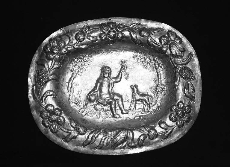 Piatto di forma ovale, con bordura decorata da motivo floreale a rilievo. Sul fondo del piatto, una scena centrale raffigura un fanciullo seduto, con il braccio sinistro teso verso l'alto che regge un grappolo d'uva, e poco distante una pecora. La scena è ambientata in un paesaggio agreste.