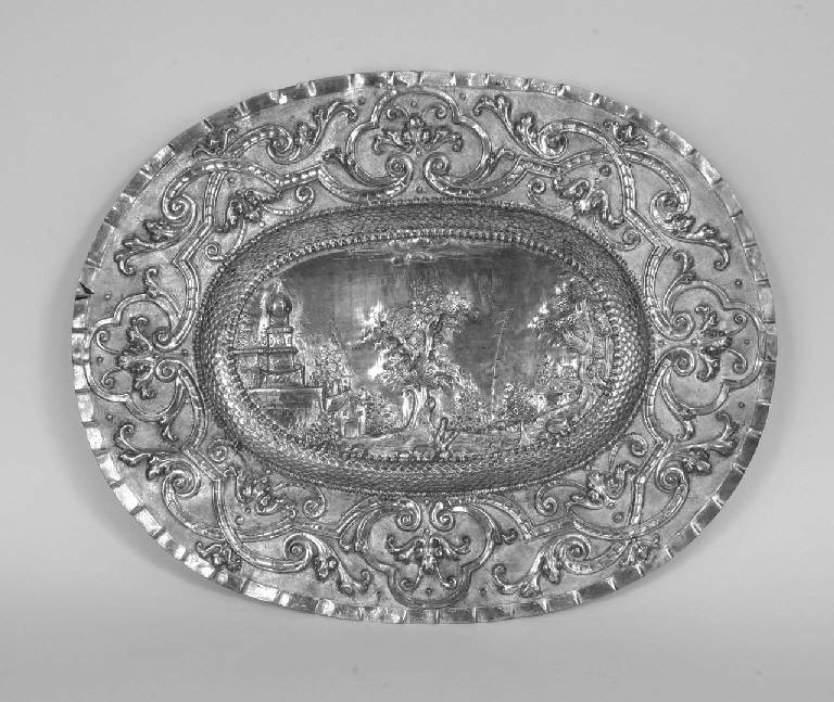 Piatto di forma ovale, con bordura decorata da motivo a volute e racemi in rilievo. Sul fondo del piatto, una scena centrale raffigura un paesaggio con alberi.
