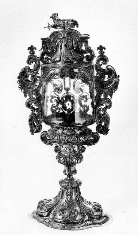 Basamento quadrilobato decorato con motivi vegetali, unito alla parte superiore da un nodo a fiore con due ante a voluta. Il vaso cilindrico è fiancheggiato da due anse simmetriche elaborate formate da foglie di palma e drappeggi. Il coperchio incernierato è costituito da un baldacchino con drappeggio sormontato da un piccolo agnello che tiene una croce tra le zampe.