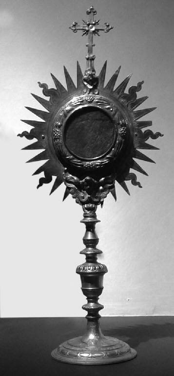 Ostensorio a tipologia romana, composto da un piedistallo circolare, con stelo decorato da più nodi. All'attacco dello stelo con la teca è raffigurata una testa di cherubino alato, che sorregge la raggiera composta da punte lineari alternate a raggi serpentinati. In cima, nella parte centrale, è posta una croce sorretta da un'altra testa di cherubino.