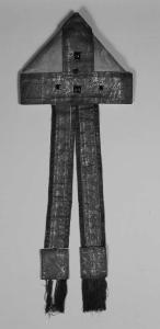 Mitria in damasco bianco con gallone che presenta un decoro con animali araldici, fiori e figure geometriche, mentre i fanoni presentano leoni affrontati, uccelli e una decorazione floreale orientale. Vi sono cucite anche cinque pietre dure con castone: due rettangolari più grandi di colore rosso e tre tonde, più piccole, di colore giallo. I fanoni terminano con un gallone identico a quello della mitria, a cui sono cucite frange di seta marroncina. Il corpo della mitria in damasco è frutto di una sostituzione tardo settecentesca.