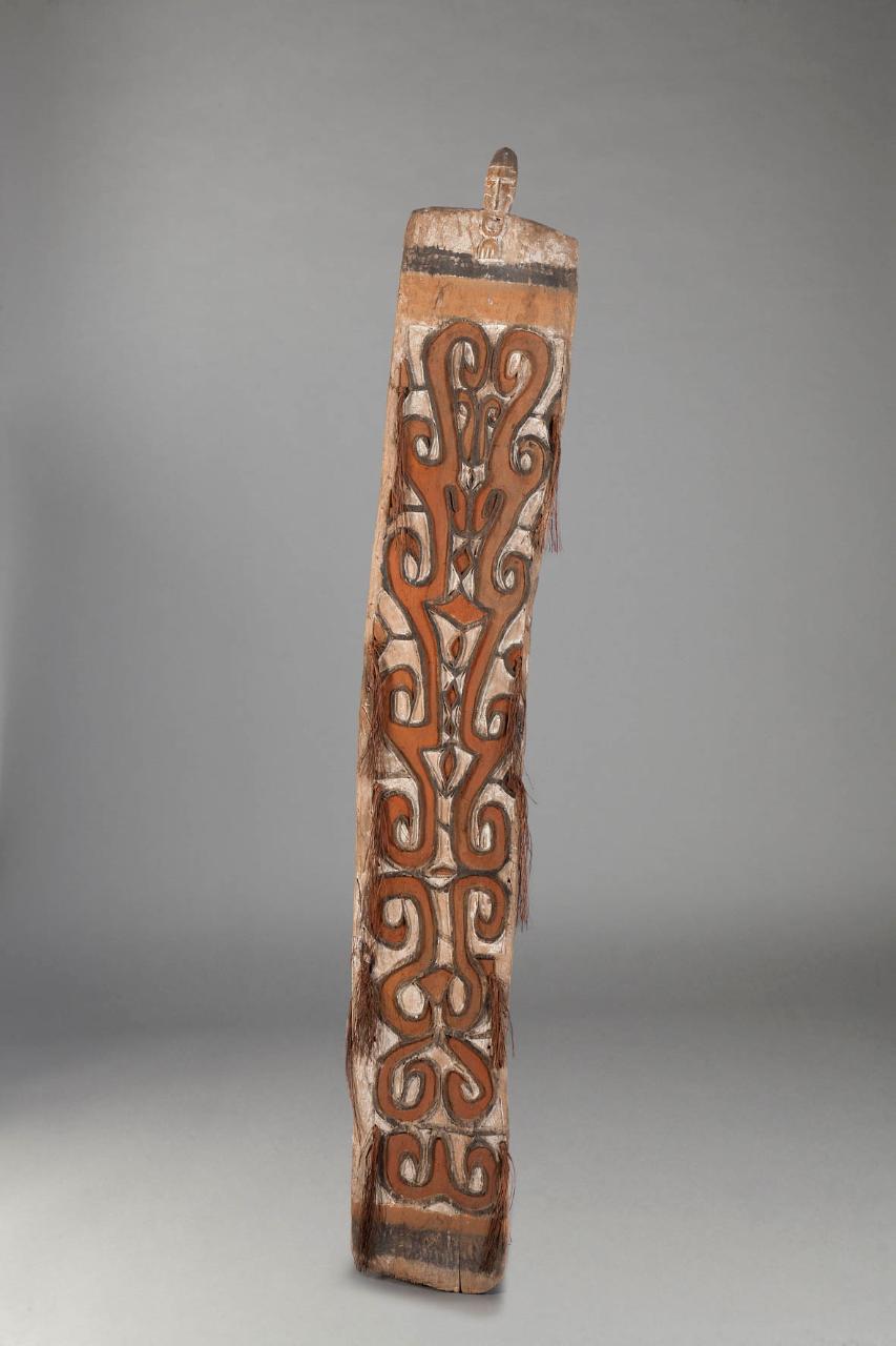 Scudo con figura sulla cima. \nLo scudo presenta una forma rettangolare e affusolata e una decorazione rossa su fondo bianco, caratterizzata da motivi a forma di coccodrillo. Il piede dello scudo presenta una fascia nera non intagliata. Ai bordi decorazioni in foglie di sago.