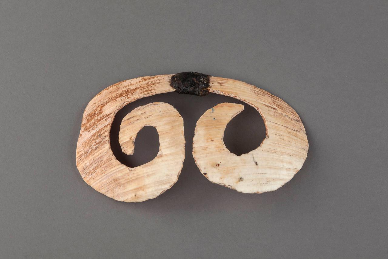 Ornamento nasale in conchiglia a forma di doppia spirale. Le due spirali sono unite al centro con della corda coperta di cera d'api.