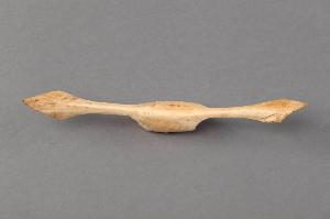 Ornamento nasale di forma allungata in osso cavo intagliato. Il corpo centrale ha forma cilindrica Le estremità sono allungate, con buchi di forma triangolare. L'ornamento è da applicarsi entro il setto nasale da parte a parte.