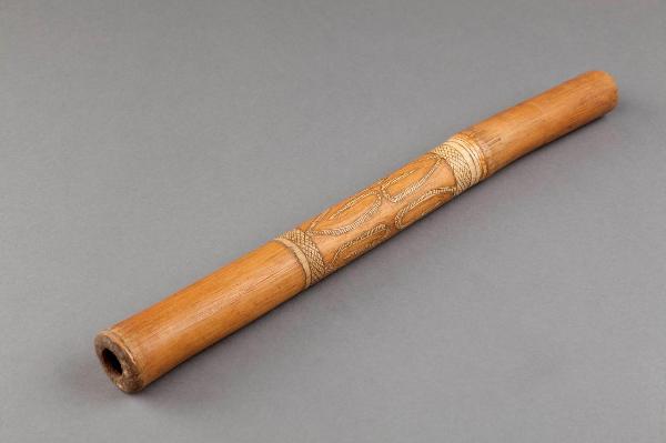 Pipa per tabacco decorata con intagli nella parte centrale: entro due fasce orizzontali con motivi a rombo è presente una decorazione geometrica con forme riconducibili al bipane. La pipa è priva dello stecco (solitamente in canna) che si inserisce nel tubo.