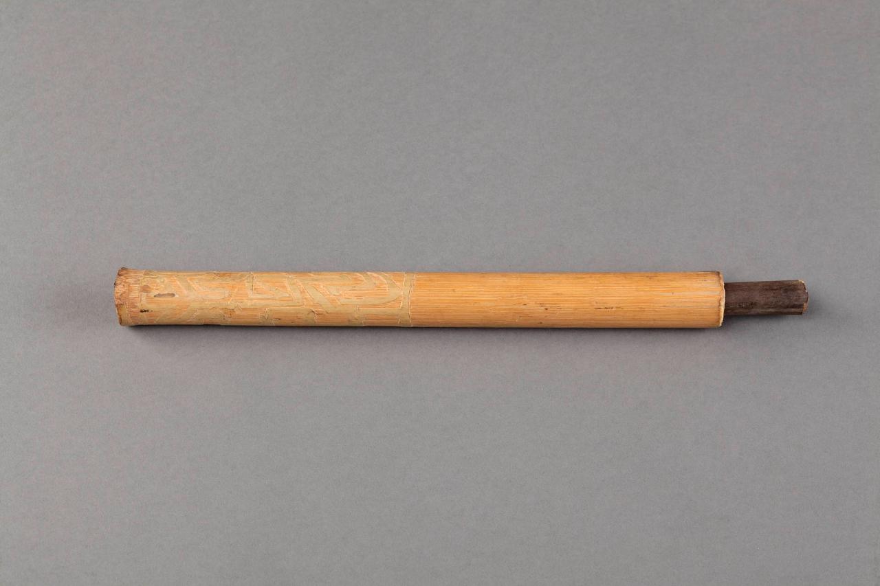 Pipa per tabacco costituita da due parti: una in bambù, cava, e una in canna da inserirsi nel primo tubo. Il corpo in bambù della pipa presenta una decorazione in rilievo nell'estremità superiore, costituita da forme geometriche.