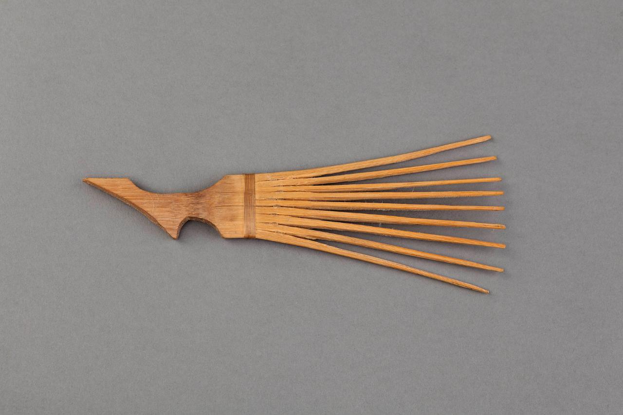 Pettine in legno con lunghi denti intagliati da un unico pezzo di legno. Tra i denti e l'impugnatura è applicata una fascia in sottili fibre vegetali.