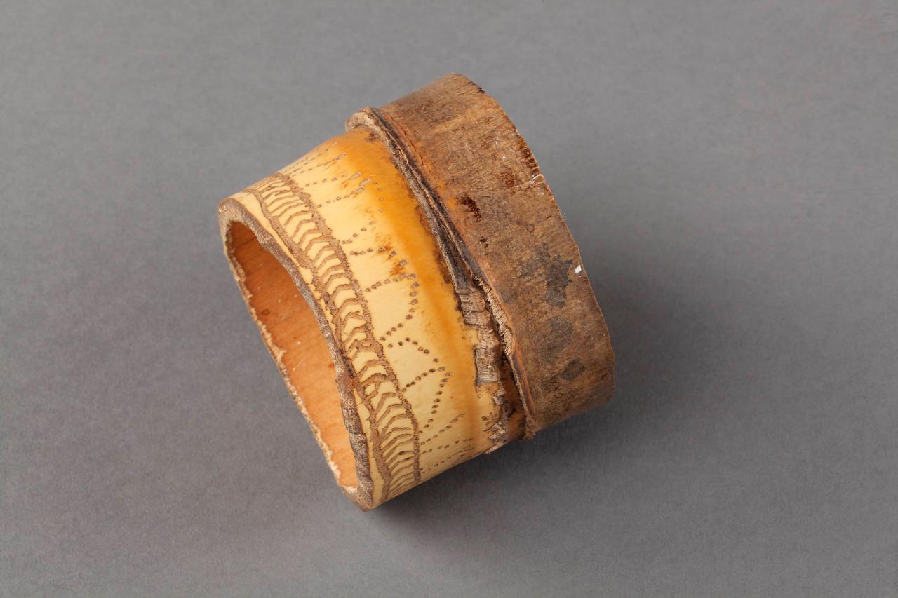 Orecchino in bambù levigato e decorato a intaglio a motivi geometrici.