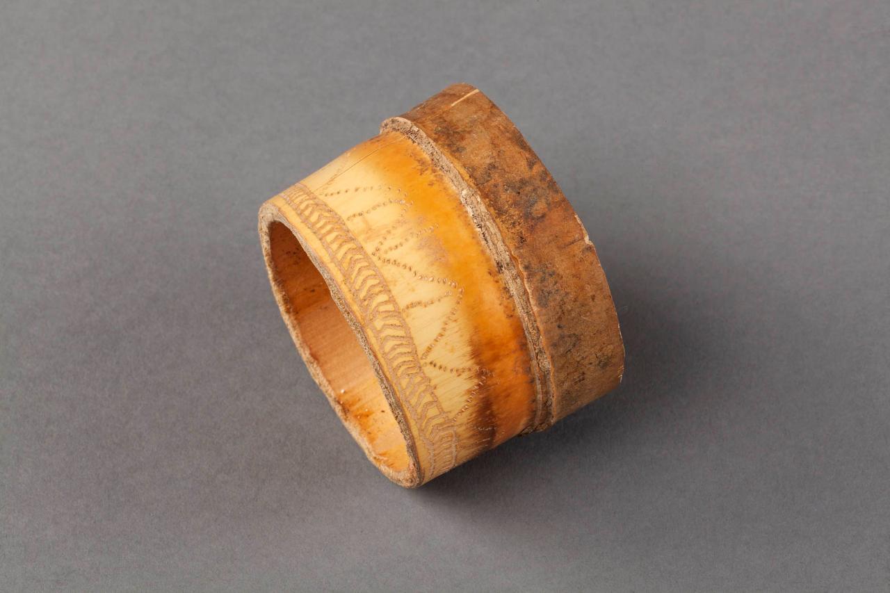 Orecchino in bambù levigato e decorato a intaglio a motivi geometrici.