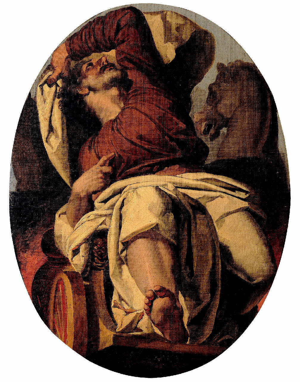 - NOTIZIE STORICO CRITICHE Si tratta probabilmente del modelletto per la decorazione ad affresco voluta nel 1831 dall'arcivescovo Carlo Gritti Morlacchi per la cupola della Cattedrale nuova di Bergamo, costruita nel 1829, e commissionata a Francesco Coghetti dopo il buon esito degli affreschi della Cappella di Santa Croce in Vescovado, terminati nello stesso anno. La decorazione, conclusa nel 1833, prevedeva sei immense medaglie ovali nelle quali, oltre al profeta Elia, erano raffigurati l'arcangelo Michele, l'angelo della Pace, gli angeli dell'Adorazione, gli angeli delle Grazie, e Abacuc trasportato dagli angeli per comando di Dio al lago di Daniele. A questi temi vennero aggiunti le rappresentazioni di S. Alessandro, titolare della chiesa, e di altri santi bergamaschi nei due rimanenti ovali. La medaglia col soggetto qui in esame, strappata nel 1851 e situata nei depositi del Duomo di Bergamo, reca la firma "F.co Coghetti / Fece Anno 1833" (Mazzocca F., 1993).