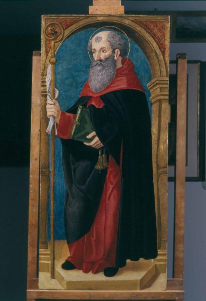 - NOTIZIE STORICO CRITICHE Il dipinto proviene dalla Chiesa di S. Maria della Consolazione ad Almenno San Salvatore. Trasferito in S. Nicola e passato di proprietà ai Lurani Cernuschi, è stato da questi depositato all'Accademia Carrara con un deposito decennale rinnovabile insieme ad altre otto tavole, tutte ascrivibili ad Antonio Boselli. Ad eccezione di una "Madonna col Bambino" di origine ignota, le altre tavole appartengono a due diversi polittici, datati rispettivamente al 1503 e al 1515. Del primo complesso facevano parte il "Battesimo di Cristo" e due tavole con "Sant'Agostino" e "Sant'Antonio Abate" (una lunetta con il "Padre Nostro" risulta dispersa). Il secondo era a due ordini: in basso una statua di "S. Rocco" (sulla quale sembra fosse riportata la data 1515) e due tavole con "San Sebastiano" e "San Cristoforo", in alto una "Madonna in trono" con "Sant'Andrea" e "San Giuseppe". Esistono ancora incertezze sulla reale disposizione delle tavole e sulla loro collocazione cronologica-stilistica.