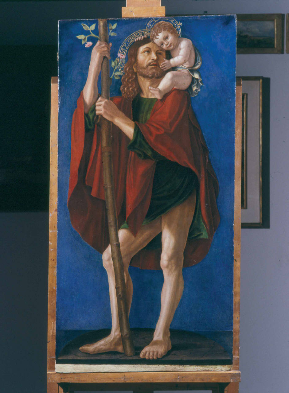 - NOTIZIE STORICO CRITICHE Il dipinto proviene dalla Chiesa di S. Maria della Consolazione ad Almenno San Salvatore. Trasferito in S. Nicola e passato di proprietà ai Lurani Cernuschi, è stato da questi depositato all'Accademia Carrara con un deposito decennale rinnovabile insieme ad altre otto tavole, tutte ascrivibili ad Antonio Boselli. Ad eccezione di una "Madonna col Bambino" di origine ignota, le altre tavole appartengono a due diversi polittici, datati rispettivamente al 1503 e al 1515. Del primo complesso facevano parte il "Battesimo di Cristo" e due tavole con "Sant'Agostino" e "Sant'Antonio Abate" (una lunetta con il "Padre Nostro" risulta dispersa). Il secondo era a due ordini: in basso una statua di "S. Rocco" (sulla quale sembra fosse riportata la data 1515) e due tavole con "San Sebastiano" e "San Cristoforo", in alto la "Madonna in trono" con "Sant'Andrea" e "San Giuseppe". Esistono ancora incertezze sulla reale disposizione delle tavole e sulla loro collocazione cronologica-stilistica.