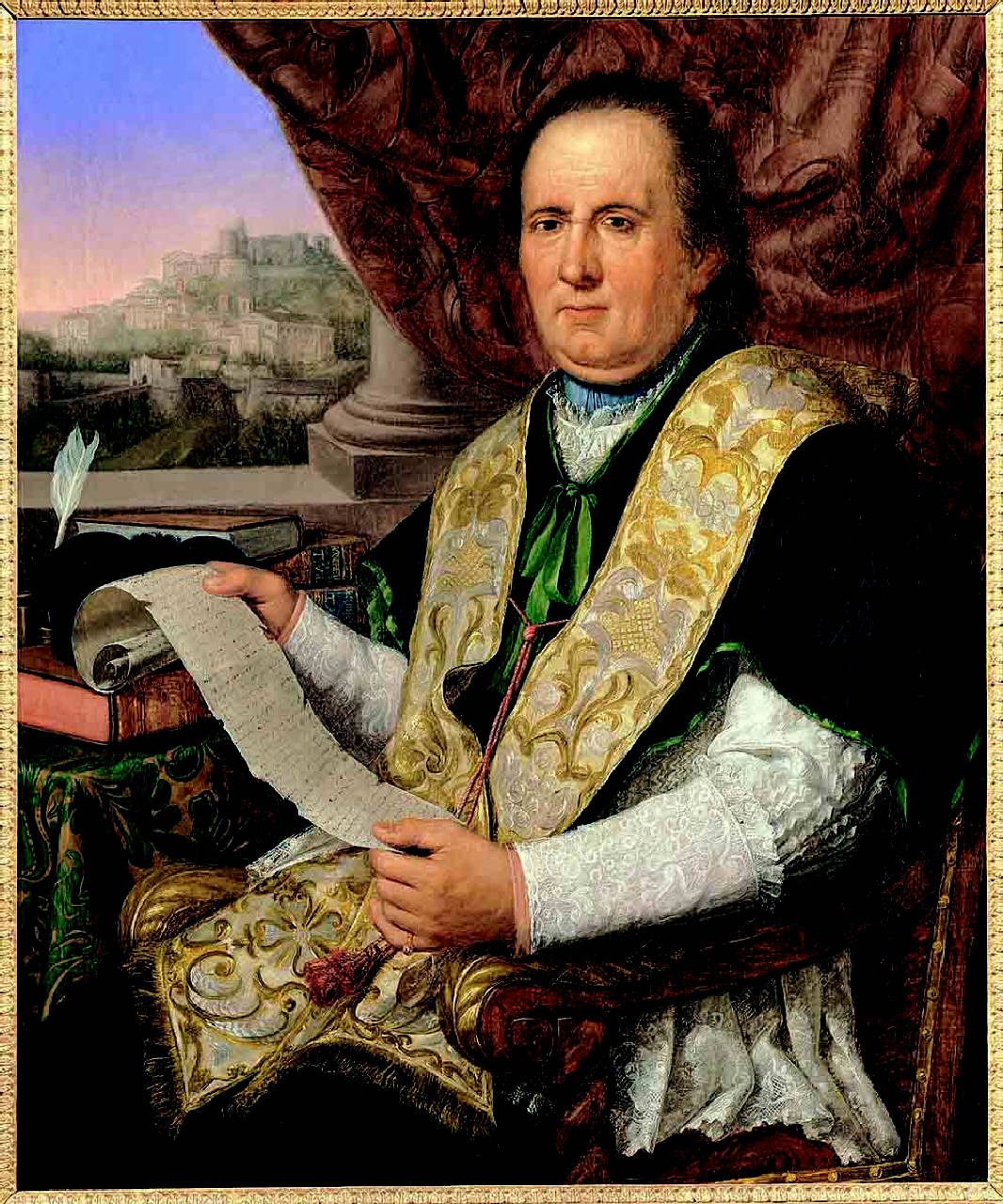 - NOTIZIE STORICO CRITICHE Il dipinto ritrae Giuseppe Ronchetti (Bergamo, 1752 - Nembro, 1838), arciprete di Nembro, curatore del secondo volume del "Codex diplomaticus" di Mario Lupo e autore delle preziose "Memorie istoriche della Città e Chiesa di Bergamo". Sullo sfondo una veduta di Bergamo Alta vista da Porta Sant¿Agostino. Il ritratto fu commissionato da Don Luigi Femi, figlio di una cugina del Ronchetti.\nCatalogo Rossi: 394/B51.