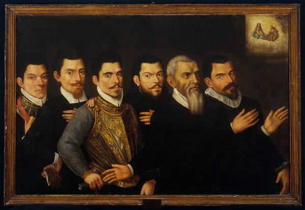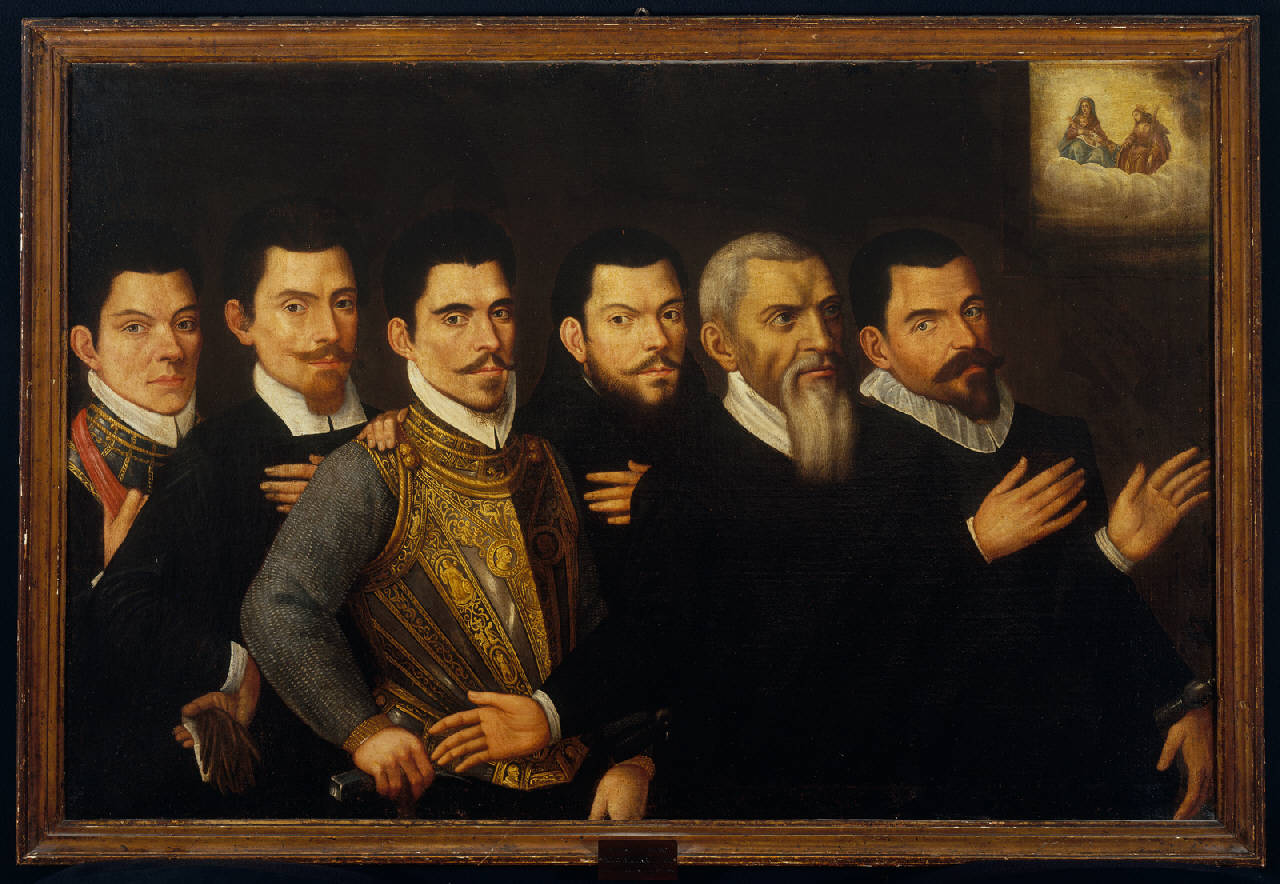 - NOTIZIE STORICO CRITICHE Il dipinto proviene dalla chiesa della SS. Trinità in Borgo S. Antonio dove fu visto da F. Caccia che lo descrisse come opera raffigurante i membri della famiglia di Paolo Berlendis, l'architetto responsabile della costruzione delle Mura venete. M. G. Ciardi Duprè (1978), pur riconoscendo nel personaggio con corazza "alla milanese" il figlio di Paolo, Giacomo Berlendis, Comandante generale della Guarnigione, ritiene poco verosimile l'interpretazione del Caccia, qualificando il dipinto piuttosto come un "ex voto" alla Madonna e a Santa Caterina offerto da "coloro che erano predisposti alla difesa e alla fortificazione della città". All'originaria ipotesi del Caccia si è recentemente riferito F. Rossi (2001) secondo cui la figura di giovane frate alle spalle dell'architetto potrebbe essere il figlio Giovanni Paolo, noto predicatore e teologo nonchè priore del Convento di S. Agostino (De Pascale, 2001). Il dipinto, depositato nel 1985 all'Accademia Carrara, è stato spostato nello stesso anno all'Accademia della Guardia di Finanza.