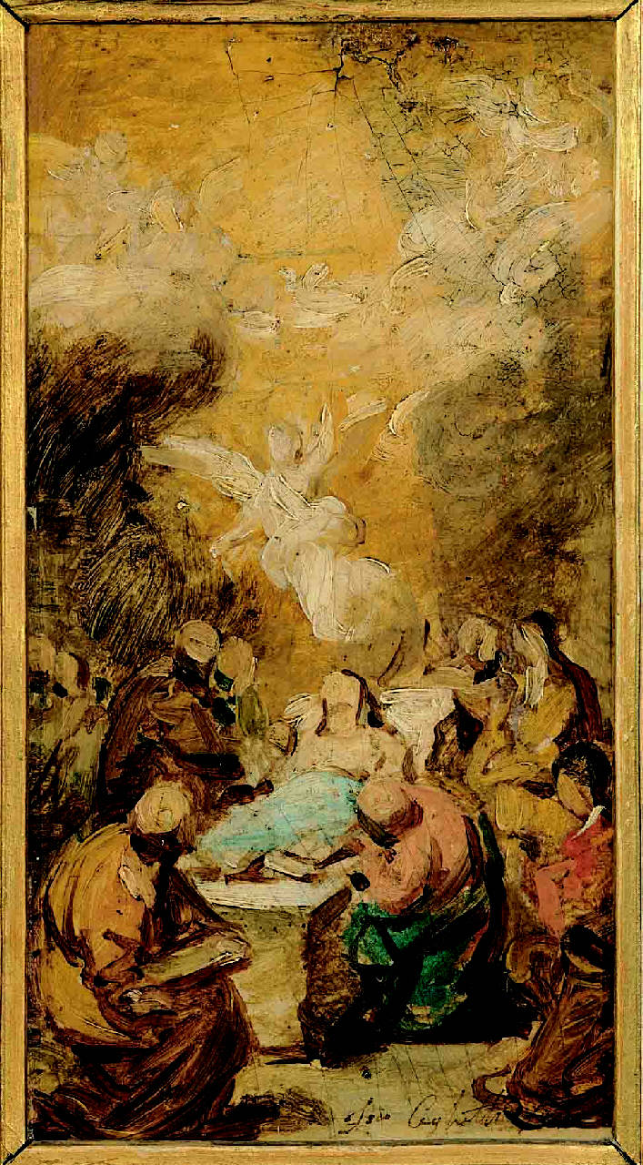 - NOTIZIE STORICO CRITICHE E' il bozzetto per la pala dell'altare maggiore della Cattedrale di Piacenza (1862). Proviene forse dalla raccolta Alessandro Tacchi di Bergamo. Si trova in deposito all'Accademia Carrara di Bergamo.\nDella pala d'altare esistono tre bozzetti preparatori: un disegno conservato alla Galleria Virgilio di Roma; un bozzetto conservato all'Accademia romana di S. Luca (n. 239) e un altro appartenente alla collezione Gulieri di Piacenza (firmato e datato a Roma 1864). L'Accademia Carrara conserva anche un disegno preparatorio (n. 2044) mentre il Comune di Bergamo un bozzetto di maggiori dimensioni.