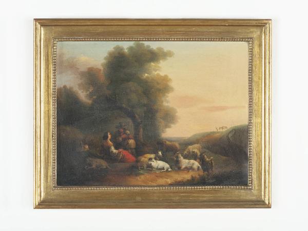 Dipinto olio su tela con la raffigurazione di un paesaggio rurale, con una figura femminile semisdraiata sotto un albero, vestita di rosso, con alcuni animali vicino; accanto a lei, figura maschile con cappello.\nLa luce proveniente da destra, mette in evidenza i volumi in modo morbido, attraverso passaggi graduali di chiaroscuro. Predominano i tocchi di colore.\nOpera inserita in una cornice in legno intagliato, modanato e dorato.